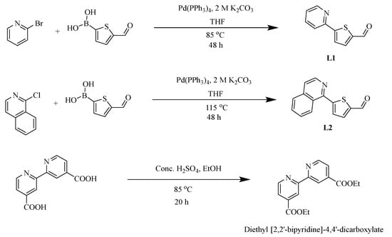Synthetic route for cyclometalating ligands L1 and L2 and diethyl [2,2′-bipyridine]-4,4′-dicarboxylate.