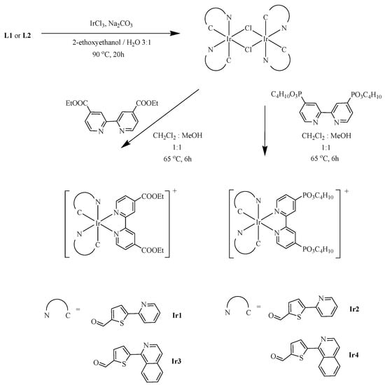 Scheme 1 and Scheme 2 demonstrate, respectively, the synthesis pathways for the C^N ligands and the iridium(III) photosensitizers. The iridium(III) photosensitizers are composed of an iridium(III) metal center with two C^N cyclometalating ligands (L1 or L2) and either a [2,2′-bipyridine]-4,4′-dicarboxylate (Ir1 and Ir3) or tetraethyl [2,2′-bipyridine]-4,4′-diylbis(phosphonate) (Ir2 and Ir4) N^N auxiliary ligand. L1 and L2 were synthesized from a classic Suzuki reaction. Preparation of target iridium(III) dyes Ir1–Ir4 involved two steps [58,59]. μ-chloride-bridged dimers were firstly synthesized by reacting the iridium(III) chloride hydrate with the corresponding L1 or L2 C^N cyclometalating ligand, which was then reacted with the N^N auxiliary ligand to obtain the iridium(III) complexes (Ir1–Ir4). All of the iridium(III) complexes are stable as solids in air.