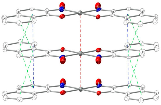 The molecules of complex PtL22∙C6H5NO2 exhibit a slightly different packing structure from complex PtL22∙CH3CN. Among the three units shown in Figure 8, the middle unit interacts with the top unit through multiple π–π stacking interactions, with either face-to-face overlap (blue lines, centroid–centroid distance = 3.342 Å) or offset fashion (green lines, centroid–centroid distance = 3.701 and 3.782 Å). Meanwhile, the middle unit interacts with the bottom unit through the offset π–π stacking interactions only (green lines, centroid–centroid distance = 3.467 Å). This difference suggests a stronger contact of the top pair, in which the two units are almost aligned along the crystallographic x axis, leading to a Pt–Pt interaction with a metal–metal distance of 3.307 (red lines) that is shorter than both Pt–Pt distances in complex PtL22∙CH3CN. However, for the bottom pair, the displaced parallel conformation gives a much longer Pt–Pt distance of 3.553 Å, which is above the upper limit of Pt–Pt interaction (3.50 Å) reported in the literature [59,60,65,66].