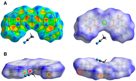 In addition to the π–π stacking interactions, interesting intermolecular interactions involving hydrogens are also observed among complex PtL22∙CH3CN units and acetonitrile molecules (Figure 7). One of the hydrogens from an acetonitrile molecule interacts with the C–O oxygen closely (blue lines, dC–H⋅⋅⋅O = 2.386 Å; ∠C–H⋅⋅⋅O = 165.6°). On the other side, the ligand backbone, the oxime oxygen interacts with one of the C–H groups from the neighboring unit (orange lines, dC–H⋅⋅⋅O = 2.529 Å; ∠C–H⋅⋅⋅O = 150.1°). A weak interaction with a larger distance is also observed between a C–H group and acetonitrile nitrogen atom (red lines, dC–H⋅⋅⋅O = 2.628 Å; ∠C–H⋅⋅⋅O = 145.8°). Meanwhile, a weak T-shaped C–H⋅⋅⋅π interaction between the aromatic C–H group and the C≡N carbon is observed (green lines) [65,66]. These interactions can be confirmed on the Hirshfeld surface mapped with dnorm (Figure 6B). The red dots highlighted by the colored circles correspond to the colored lines in Figure 6.