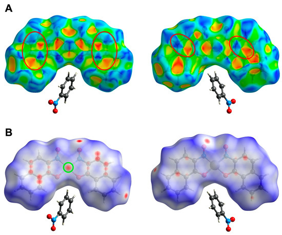 (A)—Hirshfeld surface of the middle unit mapped with surface index (left: top side; right: bottom side) showing the π–π stacking interactions. (B)—Hirshfeld surface of complex PtL22∙C6H5NO2 mapped with dnorm showing the Pt–Pt interaction (left).