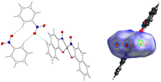 Left: weak hydrogen bonding involving nitrobenzene molecules and complex PtL22∙C6H5NO2. Right: Hirshfeld surface of nitrobenzene mapped with dnorm.