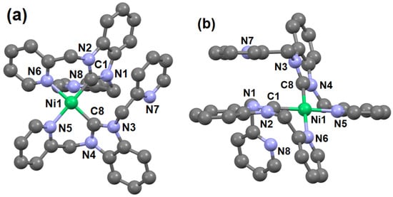 The quantitative IR spectroscopic data for ligand 2 and complex 3 were recorded without specific isotopic assignments (Figure S3). For ligand 2, the vibrational modes consistent with C=N bonds were observed at 1594 cm−1, which is similar to some previously reported N-heterocyclic carbenes. A visible shift in the C=N vibrational region was observed at 1609 cm−1 upon the coordination of nickel(II) to the NHC ligand in complex 3. This result is consistent with other reported NHC complexes [23].