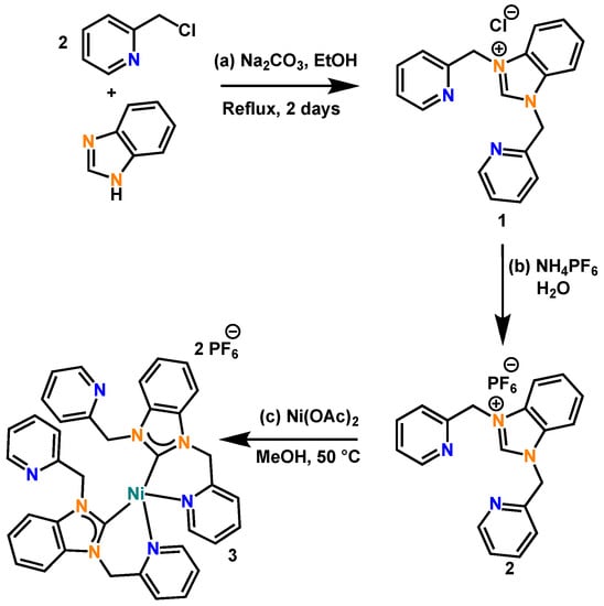 The two-step method involves the reaction of 2 equivalents of picolyl chloride with 1 equivalent of benzimidazole and heating the mixture to reflux in ethanol for 48 h. The tridentate ligand generated (1) was in good yields (83%) and the chloride anion was replaced with PF6− to form the compound 2. Compound 2 was dissolved in methanol and a solution of Ni(OAc)2·4H2O in methanol was added to it dropwise under constant stirring at 50 °C for 1 h. A clear brown solution was obtained, and brownish-yellow crystals of complex 3 were isolated from this solution in good yields (61%). The crystals of complex 3 were further characterized by X-ray crystallography, ESI-MS, and other spectroscopic techniques including UV-Vis, 1H NMR, 13C NMR, and FT-IR.