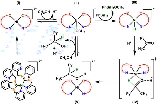 Based on our previous experience and several reported methods, we have proposed the mechanism of the reduction of ketones with silane catalyzed by complex 3, as shown in Scheme 2. In a previous report, Hartwig et al. suggested that there are two possible mechanisms [26]. They suggested that the activation of the carbonyl group takes place by the metal acting as a Lewis acid, and another mechanism proposes that a stepwise pathway could occur involving the formation of a metal hydride. The hydrogenation catalyzed by complex 3 is proposed to follow the formation of a nickel hydride facilitating the formation of the desired alcohol [26,27]. In the first step, complex (I) may abstract a methanol molecule from the solution to form a five-coordinated methoxy-substituted complex (II) and releases one proton in the solution. In the presence of phenylsilane, the -OCH3 species gets exchanged with a hydride from phenylsilane, resulting in the formation of nickel hydride species (III). The species (III) interacts with the proton-activated 2-acetylpyridine through a six-membered transition state (IV) to form the hydronickelation intermediate (V). This sterically hindered 5-coordinate species rapidly reacts with solvent, where a proton is abstracted from methanol to form 1-(pyridin-2-yl)ethan-1-ol and regenerate the active five coordinated species (II). This generalized reduction mechanism is consistent with similar pathways reported for other transition-metal-dependent catalytic systems, where further research into the structure of these intermediates may yield new insight into this process.