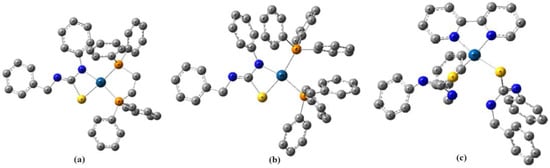 The optimized structures of [Pt(BPT)(dppe)] (1), [Pt(BPT)(PPh3)2] (5), and [Pt(BPT)2(Bipy)] (7) complexes show that the thiourea ligand with a −2 charge can coordinate to the platinum central atom through its S− and N− atoms. The final optimized geometries for these three complexes are square planar symmetry, with Pt(II) at the center, attached to P, S, and N atoms (Figure 2). The calculated bond length shows that not all four bonds to the Pt(II) are equivalent. For example, the bond distance of Pt–N possesses a shorter bond length than those of Pt–S and Pt–P. Moreover, the two phosphorus atoms that attach to the Pt(II) atom are non-equivalent. One of the Pt-P bonds has a bond length of 2.42 while the other has a bond length of 2.37 . These values are consistent with our previous work [31], which displayed the Pt-P lengths as 2.233 and 2.264 , respectively. Furthermore, it is worth mentioning that when the tertiary phosphine ligand is replaced, the Pt-P bond length can also change. These differences can be attributed to the slightly straightened ring for the dppe ligand (complex (1)) and the PPh3 ligand (complex (5)). The change in the Pt-P bond length in these complexes can be attributed to the stronger trans influence of the S atom compared to the N atom [32]. The Pt-P bond that is trans to the sulfur atom has a longer bond length, whereas the Pt-P bond that is trans to the nitrogen atom has a shorter bond length. In addition, the bond length of Pt–S in these three complexes showed a constant value of about 2.42 , but the bond length of Pt–N has different values. In complexes (1, 5, and 7), the Pt-N bond lengths are 2.06, 2.07, and 2.08 respectively. The average bond length of Pt–P in [Pt(BPT)(dppe)] (1) is shorter than the average bond length of Pt–P in [Pt(BPT)(PPh3)2] (5). The ligand field theory predicts that Pt(II), d8 has a square planar symmetry. However, the calculated bond angles are not equal to , indicating a slightly distorted square planar geometry. For example, in complex [Pt(BPT)(dppe)] (1), the bond angle of P–Pt–P is , while in [Pt(BPT)(PPh3)2] (5), the bond angle is . On the other hand, the bond angles in N–Pt–S are and for [Pt(BPT)(dppe)] (1) and [Pt(BPT)(PPh3)2] (5), respectively.