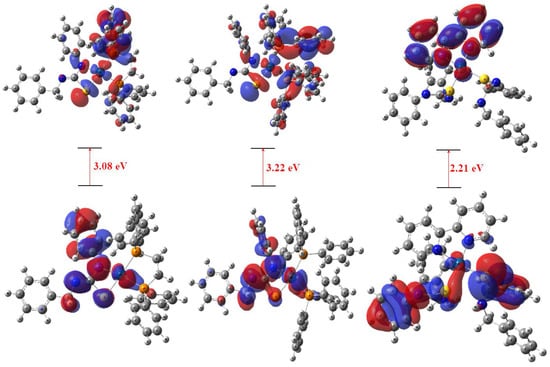 The highest occupied molecular orbital (HOMO) and the lowest unoccupied molecular orbital (LUMO) were calculated at the level of B3LYP/Def2-TZVP (Figure 3). It was found that the HOMO–LUMO gap for [Pt(BPT)2(Bipy)] (7) is less than the two other complexes. These results suggest that [Pt(BPT)2(Bipy)] (7) may be considered as a photocatalyst with electron-hole activation in the solar energy range. Figure 3 shows that HOMO and LUMO are hybridized orbitals that contain Pt d-orbitals. P atoms have less electronegativity compared to S and N atoms. Therefore, unlike their contribution to LUMO, the P atoms do not contribute to HOMO charge density.