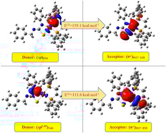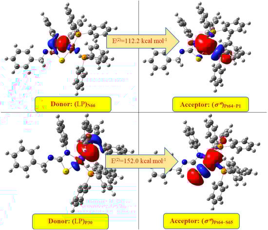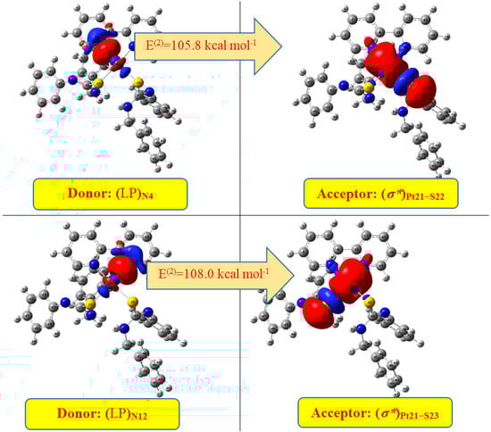Furthermore, Figure 4, Figure 5 and Figure 6 illustrate donor and acceptor orbitals for the two highest second-order perturbation energies graphically. In line with the previous discussion, these results show that P atoms are very good electron donors to the Pt bonding orbitals. The E(2) values for P donors to Pt acceptor are higher than 150 kcal.mol−1. The next level of the E(2) values belongs to the N donor and anti-bonding orbital of Pt–P or Pt–S as the electron acceptor. In addition to the donation, there is some back-donation in which charges transfer from a central Pt atom to the anti-bonding orbitals of Pt–P and Pt–S. Apparently, this charge back-donation stabilizes the complexes in the range of 10–20 kcal.mol−1. It is interesting to note that the stabilization due to the charge back-donation is higher in complexes (1) and (5) compared to complex (7). This indicates that the probability of charge back-donation is twice in complexes (1) and (5) compared to complex (7).