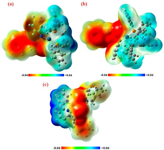 The molecular electrostatic potentials (MEP) of three selective complexes were calculated from the formatted checkpoint file. To complete this analysis, the total electronic density was considered for the MEP calculation, where the results are shown in Figure 7. In this figure, the charge distribution is represented by a range of colors. The red color is for negative MEP, illustrating the electron-rich regions, and the blue color is for positive MEP showing the regions of electron deficiency. The electron-rich regions favor nucleophilic reactions, and the regions with electron deficiency are prompt for electrophilic reactions. In this calculation, the highest positive and negative values of MEP were fixed in the range of −0.04 to +0.04. The computed images allowed the complexes to be visually compared to understand their properties. Figure 7 shows that all three complexes have bold red color regions, which can act as strong nucleophiles. However, only the dsm-6 complex can play the role of strong electrophile. In these complexes, the thiourea ligand is nucleophilic, and bipyridine is located in the electrophilic center.