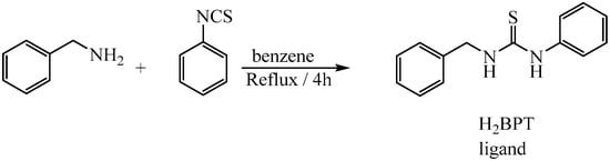 The ligand 1-benzyl-3-phenylthiourea (H2BPT) was prepared by a modified method described previously [33,34]. In brief, this ligand was prepared by adding 2.14 mL of phenylmethanamine (20 mmol) in 10 mL of benzene under stirring for 10 min. Subsequently, 2.70 mL of isothiocyanatobenzene (20 mmol) was added to the mixture, which was then equilibrated for 4 h. Finally, the mixture was recrystallized with hot ethanol to produce a white precipitate, i.e., 1-benzyl-3-phenylthiourea (yield: 5.27 g or 85%, m.p. = 186–188 °C).