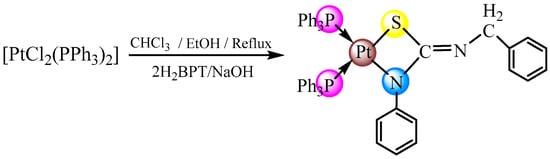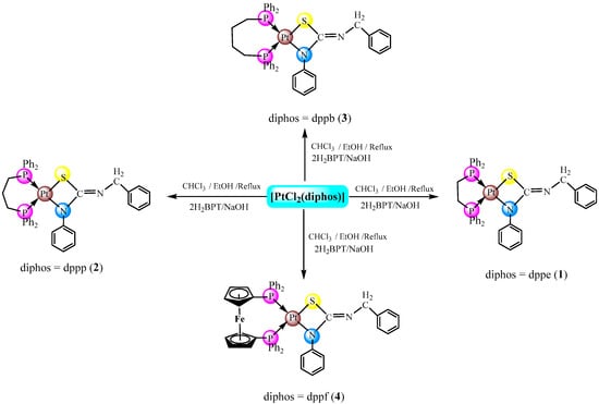The schematic diagram of the ligand 1-benzyl-3-phenylthiourea (H2BPT) synthesis is illustrated in Scheme 1. This H2BPT ligand was subsequently reacted with the following agents: tertiary phosphine and amine ligands: [PtCl2(diphos)], [PCl2(Phen)], and [PtCl2(Bipy)] in a molar ratio (1:2) in the presence of a base medium to prepare Pt(II) complexes in a dianion form, where the varying synthetic pathways are shown in Scheme 2, Scheme 3 and Scheme 4.
