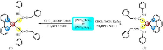 The complexes (1–7) were synthesized by following the general procedure, which included the reaction of [PtCl2(diphos)] or, [PtCl2(PPh3)2] or [PCl2(diamine)] (0.05 mmol) in CHCl3 (10 mL) with the H2BPT/NaOH ligand (0.10 mmol) dissolved in ethanol in a (1:2) molar ratio using CHCl3/EtOH as mixed solvents (1:1). The reaction mixture was stirred and refluxed for 2 h, which gave pale yellow solution. Microscale crystals of the targeted complexes were obtained upon slow evaporation of the reacted solution.