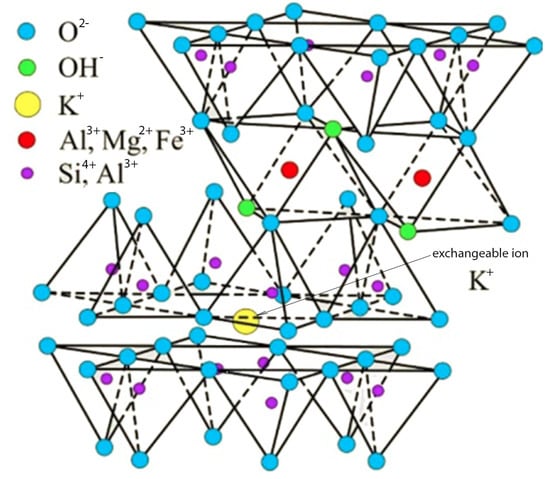 Sorption of cesium on clay minerals occurs by the ion exchange mechanism; interplanar layers of clay minerals exchange their mobile ions with the liquid phase. The exchangeable ions in the interlayer space can be Na+, K+ Ca2+, and Mg2+; as an example, Figure 1 shows the illite mineral, where the exchanging ion is K+. In Figure 1, it is indicated by an arrow.