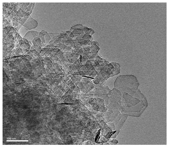 In the sorption on clays, the surface structure is of great importance. For example, bentonite clay particles (Bent–Ru sorbent) are mainly hexagonal-shaped, with the predominant size in the range of 10–100 nm (Figure 2). The block structure of illite particles contributes to the formation of a rather large specific surface area of 22 ± 1 m2 g−1, defining the high degree of radionuclide sorption from aqueous solutions [54].