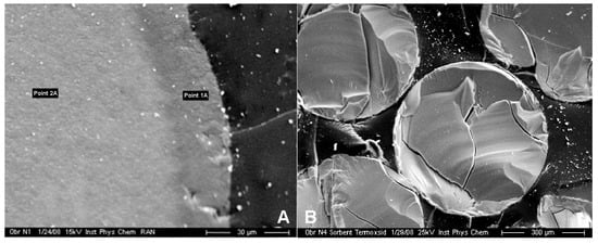 Scanning electron micrograph/image of FNS (A) and Termoksid-35 (B) sorbent granules’ cross-sections (SEM analysis data).