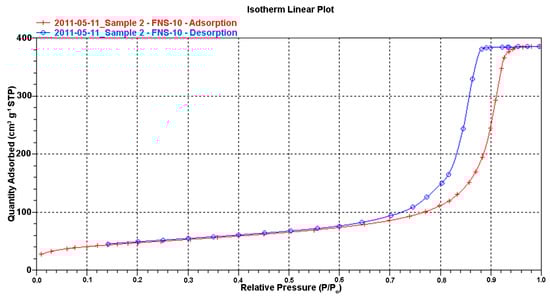 Nitrogen (N2) adsorption/desorption isotherms of FNS sorbent. X-axis is the p/po- the relative pressure of the nitrogen gas; po is the saturated gas pressure, Pa; Y-axis is the amount of adsorbed nitrogen gas, cm3g–1 of the sorbent.