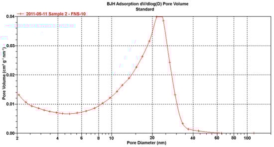 BJH pore size distribution of FNS sorbent. X-axis is the pore diameter, nm; Y-axis is the volume of pores of a specific diameter, cm3g–1 of the sorbent.