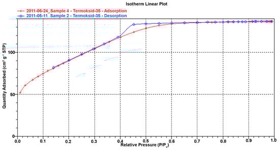 Nitrogen (N2) adsorption/desorption isotherms of Termoksid-35 sorbent. X-axis is the p/po—the relative pressure of the nitrogen gas; po is the saturated gas pressure, Pa; Y-axis is the amount of adsorbed nitrogen gas, cm3g−1 of the sorbent.