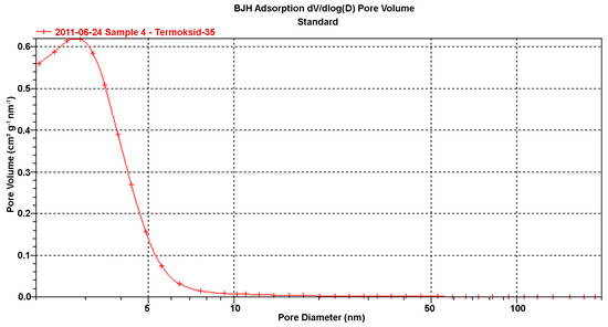 BJH pore size distribution of Termoksid-35 sorbent. X-axis is the pore diameter, nm; Y-axis is the volume of pores of a specific diameter, cm3g−1 of the sorbent.