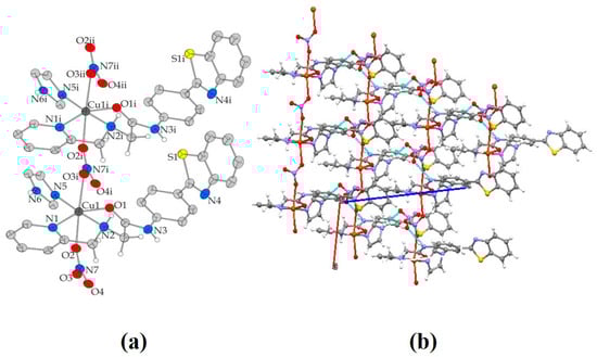 (a) The molecular structure of complex Cu-1 indicating the polymeric chain formation. Counterions and aromatic hydrogen atoms have been omitted for clarity. Thermal ellipsoids were drawn with 40% probability; (b) hydrogen-bonding interactions (in blue dotted lines) in complex Cu-1.