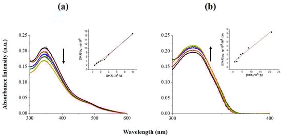 In order to determine the mode and the extent of the interaction of complex Cu-1 with CT-DNA, UV-vis electronic absorption spectra were recorded upon increasing the concentration of CT-DNA in the 300–600 nm wavelength region by monitoring the intensity changes in the intraligand π–π* transition band at 338 nm of the phenylbenzothiazole moiety [29]. As it is evident from Figure 4a, a progressive decrease of the intensity of the band at 338 nm was observed upon the addition of DNA, with no indication of shift of the absorption maximum. The displayed hypochromism reached 29% for the higher ratio, R = 10. Hypochromism is a common characteristic of intercalation of a molecule into DNA base pairs, due to the strong stacking interaction between the aromatic chromophore and the base pairs [22]. Furthermore, to quantitatively determine the DNA binding affinity of complex Cu-1, the intrinsic binding constant with DNA, Kb, was obtained by fitting the spectroscopic titration data at 338 nm to Equation (1) (Figure 4, inset plot). The value of Kb was to be equal to 2.67 ± 0.75 × 106 M−1, a value that is in accordance with the ones reported for classical intercalators bound to CT-DNA that have binding constants within the range of 106–107 M−1 [30]. As previously shown [22], the addition of DNA in the presence of ligand L1 (Figure 4b) induced hyperchromism and bathochromism whereas the calculated Kb was two orders of magnitude lower (~104 M−1). Hence, it is clear that a different mode of interaction with CT-DNA takes place with the copper complex under study that binds more strongly than ligand L1. Thus, the obtained data in our case are consistent with the intercalation of the complex Cu-1 into the double helix of DNA. Our results are comparable with [31,32] or superior to [30,33] those of copper complexes reported to interact with DNA via intercalative mode with Kb values ranging from 104 to 106 M−1.