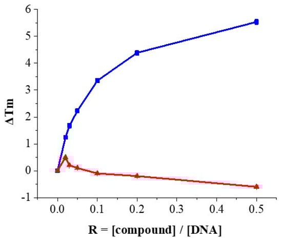 Thermal denaturation data of CT-DNA (5 × 10−5 M) upon addition of Cu-1 (blue line) and L1 (red line) (0–2.5 × 10−5 M) with ratios R = [compound]/[DNA] ranging from 0 to 0.5.