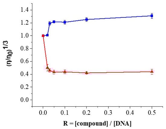 Experiments were carried out in PBS (final DMSO content = 2%) by keeping the DNA concentration constant (5 × 10−5 M) while varying the concentration of compound (0–2.5 × 10−5 M) to achieve ratios R = [compound]/[DNA] of 0, 0.01, 0.02, 0.033, 0.05, 0.1, 0.2, 0.33, 0.5. The intrinsic viscosity η was calculated according to the relation η = (t − t0)/t0, where t0 is the flow time for the buffer and t is the observed flow time for DNA in the presence or absence of the complexes. Data are presented as (η/ηo)1/3 versus R where η and ηo are the intrinsic viscosities in the presence or absence of the compounds. For the low DNA concentrations used in these experiments, the intrinsic viscosity η is proportional to the difference in the flow times for the buffer with and without DNA, resulting in the following Equation (3):