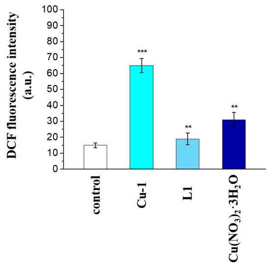 DCF fluorescence intensity of cells after treatment with Cu-1, the corresponding L1 and Cu(NO3)2·3H2O as a measure of the reactive oxygen species produced. Values represent the mean ± SD of three independent experiments and the significance level was set as ** p < 0.01 and *** p < 0.001 compared to control (untreated cells).