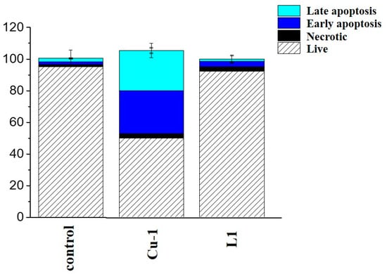 Quantification histograms representing the populations of living, early/late apoptotic and necrotic MCF-7 cells after treatment with Cu-1 and the ligand L1. Values represent the mean ± standard deviation (SD) of cell population obtained in two independent experiments.