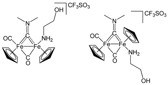 In the 13C NMR spectra of 2–3, the signals due to the aminocarbyne carbon have been found in the 332.9–330.8 ppm range [24,67,68], while those of the terminal and bridging CO ligands are at 214.5–212.2 ppm and 270.8–268.5 ppm, respectively. This feature confirms that the amine coordination to iron does not affect the Fe2Cp2(CO)2 framework and the aminocarbyne moiety [24,25].