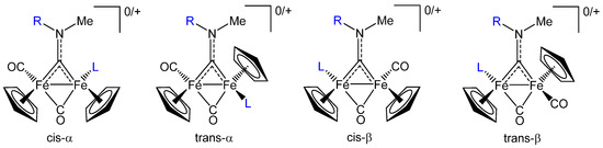 Remarkably, complexes of type 1, and their cationic derivatives, are normally air-stable and rather inert in aqueous solutions, and these features have recently fueled the exploration of their potential use in medicine [27,28,29] and catalysis [30,31,32]. The replacement of one or two carbonyls from 1 is key to their derivatization, including C-C and C-N coupling reactions involving the carbyne center [24,25,33]. However, the simple introduction of one terminal ligand (L) different from CO may produce a significant impact on the physicochemical properties and aqueous stability of the resulting diiron aminocarbyne compounds [29,34]. In principle, the CO/L mono-substitution reaction may generate cationic or neutral adducts (depending on the charge of L) existing in different isomeric forms, i.e., cis and trans isomers (with reference to the mutual geometry of the Cp rings with respect to the Fe-Fe axis), and α and β isomers (with reference to the mutual orientation of L and the aminocarbyne R substituent), as seen in Scheme 2 [24,25]. Relevant to the latter point, it should be noted that the α/β isomerism, arising from the double bond nature of the carbyne–nitrogen linkage, may be not observed when both R and L are bulky units (i.e., the α isomer largely prevails) [35,36], and disappears when R = Me. In contrast, cis isomers are usually more stable than the corresponding trans isomers, the latter being observed due to a combination of steric and electronic factors [25,37]. The interconversion in solution between trans and cis forms, and consequently between α and β forms, is practicable in certain cases under thermal treatment, and possibly obeys the Adams–Cotton mechanism whereby ligands undergo site exchange through open-bridged structures [37,38,39,40].
