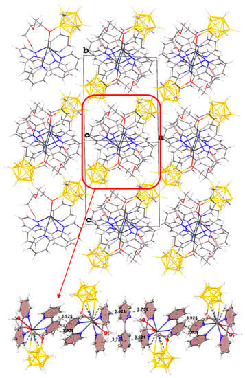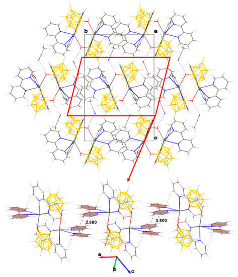 Thus, three different anions [B10H9O(CH2)5O(CH2)2OH]2− are coordinated on each metal atom, resulting in 2D polymer networks parallel to plane bc (Figure 6). The anions in the planes are also additionally linked by OH…O hydrogen bonds (O…O distance 2.60 Å, angle O–H…O = 165.1°). The planes turned to each other by bipyridyl fragments are interconnected due to π–π stacking interactions (centroid–centroid distance 3.73 Å, angle 6.0°, shift distance 1.16 Å). Additionally, the planes are connected by dihydrogen CH…HB interactions between the methyl groups of the exopolyhedral substituent, the CH groups of the bipyridyl, and the BH groups of the boron cage.