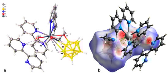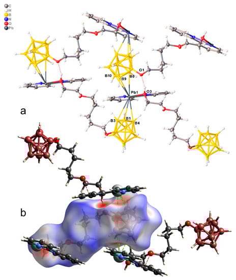 The crystallographically independent part of the monoclinic unit cell (P21/c) of compound 1·CH3CN contains complex [Pb(bipy)2[B10H9OH]] and one solvate acetonitrile molecule (Figure 1a). The [B10H9OH]2− anion acts as a bridging ligand, thus forming binuclear complex [(bipy)2Pb[µ-B10H9OH]]2. The boron cluster anion is co-ordinated via the B3B4B8 faces, the B1B2 edge, and through the O atom of the hydroxy group. On the Hirschfeld surface (Figure 1b), the Pb–B contacts are marked as extensive red spots and dotted red lines. The co-ordination environment of lead thus includes four N atoms from two acetonitrile molecules, the B1B2OH edge, and the B41B51 (1 1 − x, 1 − y, 1 − z) edge of the second anion. However, it is not possible to draw a clear boundary between the face and edge co-ordination of the anion in this case (Table 1).