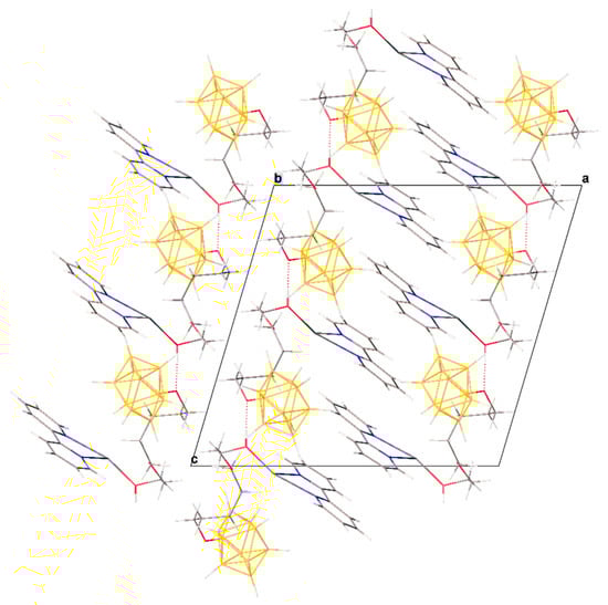 In the packing of complex 1·CH3CN (Figure 2), binuclear complexes [(bipy)2Pb[µ-B10H9OH]]2 are arranged in columns parallel to axis a and are connected by π–π stacking interactions (centroid–centroid distance 3.800 Å, angle 10.0°, shift distance 1.931 Å). On the Hirschfeld surface of the anion (Figure 1a), it is clear that the columns are coupled to each other due to weak CH…HB interactions. This type of contact accounts for 79.6% of the total surface of the [B10H9OH]2− anion, while the H…Pb contacts account for 4.4% of the surface, and the Pb…B contacts account for 0.6% of the anion surface. The free acetonitrile molecule is located in the voids formed by four “columns” and is hydrogen-bonded to the hydroxy group (O…N distance 2.96 Å, N…H–O angle 159.1°).