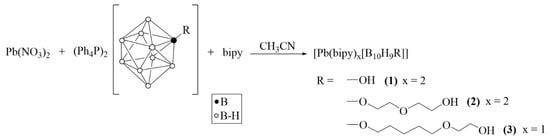 Lead nitrate (99%), 2,2′-bipyridyl (bipy) (99%), aluminium chloride (anhydrous, powder, 99.99%), acetonitrile (for HPLC), tetrahydropyran (99%), dichloromethane (99%), potassium methoxide (95%), ethylene glycol (99%), ethanol (99.5%), cesium fluoride (99%), tetraphenylphosphonium chloride (99.9%) were purchased from Sigma-Aldrich (St. Louis, MO, USA) and used without additional purification. Tetraphenylphosphonium [2-hydroxy]nonahydro-closo-decaborate (Ph4P)2[B10H9OH] was synthesized according to a previously developed procedure [56]. Tetraphenylphosphonium 2-[2-(2-hydroxyethoxy)ethoxy]nonahydro-closo-decaborate (Ph4P)2[B10H9O(CH2)2O(CH2)2OH] was synthesized according to the reported method [57].
