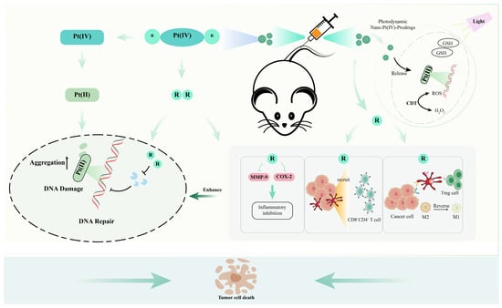 Multiple pathways to increase the antitumor effect of Pt-based drugs. The breakdown of nanomaterials or Pt prodrugs to yield Pt(II) drugs, which damage DNA, increase drug aggregation in cells or reduce DNA repair activity, can enhance tumor inhibition or reduce drug resistance. PTT/PDT can facilitate the targeted release of Pt-based drugs to enhance antitumor efficiency or reduce toxic side effects. In addition to their adjuvant role, axial ligands of Pt drugs can be involved in the immune response in vivo. They enhance the antitumor effects of Pt-based drugs by reversing macrophage polarization, recruiting immune cells and inhibiting tumor-associated inflammatory responses.