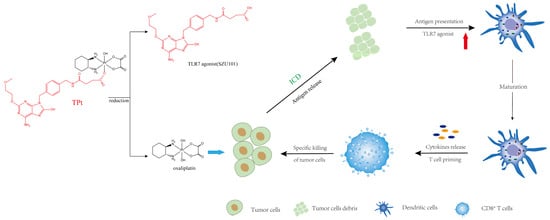 Scheme of combinations with immune agonists to improve T-cell responses. Immune agonists, such as a TLR7 agonist, conjugated with oxaliplatin, can accelerate T-cell maturation, activating prime T cells into mature T cells. Mature T cells release cytokines and exert specific killing effects on tumor cells. Antigens, released by tumor cells going through immunogenic cell death, will perform a synergistic effect with immune agonists to improve T-cell responses to tumor cells. Reprinted with permission from Ref. [36].