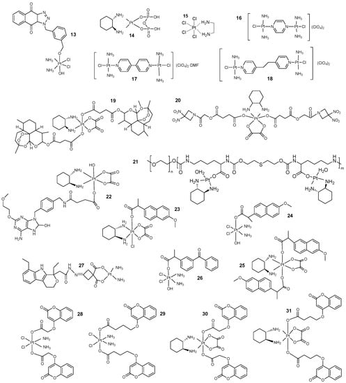 - Zang, J.; Zhang, B.; Wang, Y.; Wang, X.; Gou, S. Design, Synthesis and Biological Evaluation of Antitumor Platinum(II) Agents Conjugated with Non-Steroidal Anti-Inflammatory Drug Species. Bioorg. Chem. 2022, 120, 105633. [Google Scholar] [CrossRef]