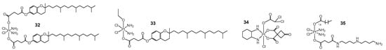 Multi-targeting structure modification to actualize diverse antitumor actions. (32, 33) Pt(IV) complexes of vitamin E and a-TOS. (34) Structure of compound designed by Su’s group. (35) Polyamine-Pt(IV) prodrug.