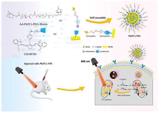 Mechanism of NIR-based photothermal therapy in Pt-based drugs. This structure has both hydrophilic and hydrophobic ends, which is the structural basis module for this hybrid drug’s self-assembling into nanoparticles, making the intracellular accumulation easier. Via NIR Irradiation, this basic module will be degraded into 5 parts, which then target the nucleus and mitochondrion, resulting in ROS enhancement and GSH reduction. In addition, there also exists mt DNA damage and MMP decline in the mitochondrion. Reprinted with permission from Ref. [73].