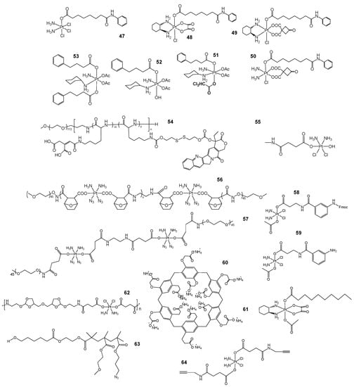 A series of HDACi-containing Pt(IV) prodrugs, 47, 48, 49 and 50 (Figure 9), were designed and prepared by Zichen Xu et al. for multiple targeting of genomic DNA, histone acetylase and PARP-1 [89]. The article illustrates the significant antiproliferative activity of the prepared Pt(IV) prodrugs against cisplatin-resistant tumor cells. These compounds mainly resulted in increased DNA damage in chromatin and inhibited the repair process. Dan Gibson’s group prepared a series of double- and triple-acting Pt(IV) analogs 51, 52 and 53 (Figure 9) based on the currently more effective Pt(IV) complex satraplatin, cct-[Pt(NH3)(c-hexylamine)Cl2(OAc)2], in order to overcome satraplatin analog drug resistance, most of which exhibited improved water solubility in the analogs [90,91]. They found that one of the triple-acting compounds, 51 (Figure 9), was active in all cell lines, causing DNA damage to induce apoptosis. In addition, targeting HDAC and nuclear DNA is a promising therapeutic strategy.