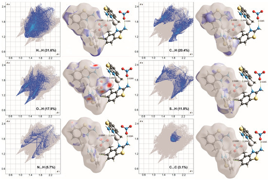 A 2D finger plots showing intermolecular interactions in complex 2, percent contribution for each contact is specified.