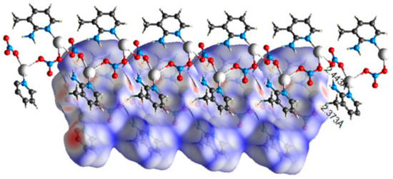 Complex 4 is orthorhombic with space group P212121, where two molecules of the ligand (2-amino-3-methylpyridine) are coordinated to the metal ion, affording a polymeric structure (Figure 4). The structure of the molecule indicates that a reaction occurs between metal and ligand in equimolar amounts. Ligand is linked to the metal ion with the help of a strong nucleophilic N center (pyridine), as has been observed in complex 2 and other related complexes [36,37,38,39]. In the subject complex, the ligand acted in a slightly different way than the expected. The ligand bridges two metal ions together through its endocyclic (N) and exocyclic (NH2) N-atoms, thus affording the formation of a polymeric structure. The Ag(1)-N(1) is 2.218 Å, which is slightly longer than the Ag-N bond in complex 2. In the extended structure of complex 4, the main role has been played by the nitrate anion. The geometry around the metal ion is distorted tetrahedral, with bond angles N(1)-Ag(1)-O(2), N(1)-Ag(1)-O(1), N(1)-Ag(1)-N(2), N(2)-Ag(1)-O(1) and O(1)-Ag(1)-O(2) around silver metal atom of 143.81, 127.59, 109.17 82.87 and 77.40°, respectively. The difference in bond distances between the nitrogen and oxygen atoms of nitrate groups [N(3)-O(1), N(3)-O(2) and N(3)-O(3) 1.242, 1.256 and 1.233 Å] could be attributed to unequal participation of the O atoms in non-covalent interactions. In complex 4, various non-covalent interactions are observed, namely O2NO···H-NH, Ag···O, Ag···N, Ag···H, Ag···C, H2CH···O and O2NO···H-C, which stabilize the 3D structure of the complex.