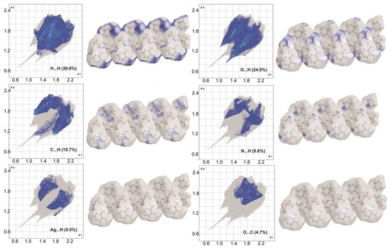 There are two red spots on the Hirshfeld surface (Figure 6), indicating H-bonding contacts due to C—H···O and N—H···O interactions (2.373 and 2.443 Å, respectively). Like compound 2, H···H interactions (30.0%) contribute the most to the Hirshfeld surfaces; however, unlike 2, the contribution due to the O···H/H···O (24.0%) and the C···H/H···C (15.7%) contacts are swapped (Figure 7). The interatomic contacts due to N···H/H···N interactions (5.6%) in 4 are comparable to those in 2, followed by a significant contribution from Ag···H/H···Ag contacts (5.0%) appearing as two symmetrical peaks in the two-dimensional finger plots. Other interactions that involve Ag atoms are Ag···O/O···Ag (3.9%), Ag···N/N···Ag (3.2%) and Ag···C/C···Ag (2.0%) contacts. The O···C/C···O (4.7%) and O···N/N···O (2.3%) interactions in 4 are also more pronounced than those in 2. The interatomic contacts due to N···C (1.0%) and C···C (0.5%) π interactions contribute the least to the crystal packing.