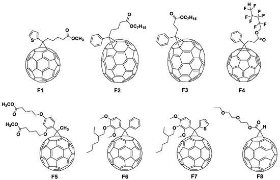 Herein, we present the synthesis, characterization and systematic study of a series of methanofullerenes F1–F8 as electron transport layer materials in PSCs (Figure 1). Differently functionalized methanofullerenes were used since they are related to PC61BM, the most commonly used electron transport material for p-i-n PSCs. The choice of structures of the target compounds was rationalized as follows. Compound F1 represents a longer-chain analogue of ThC61BM material reported previously [35]. The thiophene ring is expected to be capable of defect healing on the surface of lead halide perovskite films particularly due to the chelation of undercoordinated Pb2+ surface cations by sulfur atom. Increase in the length of aliphatic substituent in F1 was expected to increase material solubility in organic solvents and thus improve the film’s quality. The heptyl ester groups were introduced in compounds F2–F3 for the same purpose. Compound F4 was loaded with a fluorinated side chain considering the advantages of such type of compounds as discussed above. Compounds F5–F7 were engineered to enable through-space electronic interactions of the ether oxygen atoms with the fullerene π-system, which were reported to reduce electron affinity of the material (increase LUMO energy) and provide better matching to the perovskite conduction band [36,37]. Finally, compound F8 was designed through incorporation of a single compact oligoether substituent at the cyclopropane ring to enable (1) high material solubility in organic solvents and (2) good adhesion (due to similar surface energy) of the fullerene derivative to the perovskite absorber layer.