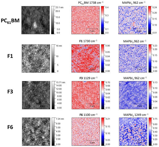 Some typical cases of perovskite/ETL bilayer stack morphology: topography (left column) and IR s-SNOM images recorded at the characteristic frequencies of the ETL material (middle column) and perovskite absorber (right column). The used fullerene derivatives are listed on the left side.