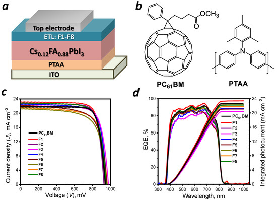 All fullerene derivatives were explored as ETL materials in p-i-n PSCs; the device architecture is shown schematically in Figure 3a. To assemble the devices, glass slides covered with transparent conductive layer of tin-doped indium oxide (ITO) were vigorously cleaned and then covered with thin films (~20 nm) of hole transport material poly[bis(4-phenyl)(2,4,6-trimethylphenyl)amine] (PTAA, Figure 3b). Bication cesium-formamidinium (Cs0.12FA0.88PbI3) lead halide perovskite absorber layer was spin coated atop dried PTAA films and subjected to thermal annealing inside the glove box (see details in Materials and Methods). Afterwards, the electron transparent layer was formed by spin-coating chlorobenzene solutions of PC61BM or one of the fullerene derivatives F1–F8. The device structure was completed by thermal evaporation of the top metal electrode (Mg/Ag or Al).