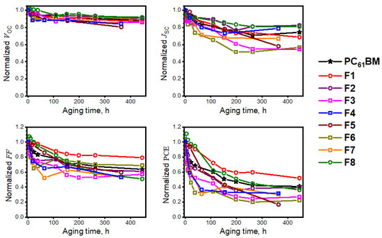 The results of the performed tests are shown in Figure 4, where normalized solar cell parameters are plotted as functions of the aging time. One could notice that while the open circuit voltage remains relatively stable upon aging, JSC and FF parameters decrease considerably, thus pointing towards a developing problem with the charge extraction and/or transport through ETL to the top electrode.