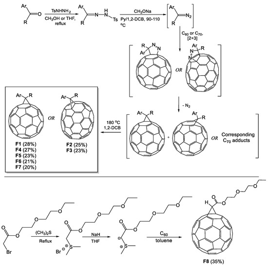 The synthesis of fullerene derivatives F1–F8 was accomplished using well-established synthetic methods (Scheme 1) [38,39]. Aromatic ketones were converted to the corresponding tosyl hydrazones by the treatment with tosyl hydrazide in methanol or THF (in the case of F4 due to lability of the fluoroalkyl ester group). The prepared tosyl hydrazones were used to generate the corresponding diazo compounds in situ upon the treatment with MeONa and pyridine. The [2+3]cycloaddition of diazo compounds to the fullerene cage in 1,2-dichlorobenzene was coupled with the nitrogen extrusion from the intermediate pyrazolinofullerenes, thus affording a mixture of methanofullerenes and fulleroids with an opened 6-5 bond. Heating these mixtures at reflux in 1,2-dichlorobenzene promoted isomerization of the fulleroids to the corresponding methanofullerenes, which were then isolated by column chromatography on silica.