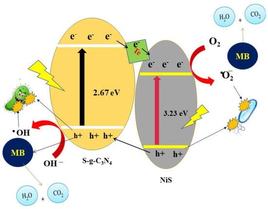 - Iqbal, S.; Bahadur, A.; Javed, M.; Liu, G.; Al-Muhimeed, T.I.; AlObaid, A.A.; Ahmad, Z.; Feng, K.; Xiao, D.J. Synergetic intimate interface contacts of 2D/1D Sg-C3N4/Co-NiS heterojunction with spatial charge separation for boosting photodegradation of MB and inactivation of pathogens under visible light irradiation. J. Alloys Compd. 2022, 892, 162012. [Google Scholar] [CrossRef]